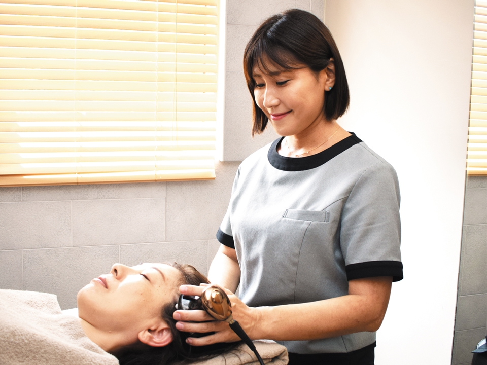 「以前は、疲れ=肉体疲労でしたが、最近は疲れの質が複雑化している印象があります。電子機器の発展に伴い〝脳疲労〟を抱える人が増え、頭皮の硬い方や眼精疲労、頭痛などを訴える人が多く、主訴にも変化が見られます。多くのお客さまは頭部を温めることが未知の体験であり、〝こんなにも気持ち良いなんて〟と皆さんおっしゃいます。施術中は寝落ちしてしまい、後を引く忘れられない心地良さで、しっかり眠れるようになったという声もよく聞きます」