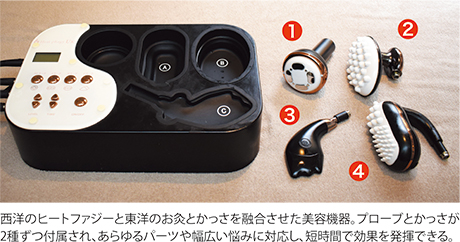 西洋のヒートファジーと東洋のお灸とかっさを融合させた美容機器。プローブとかっさが2種ずつ付属され、あらゆるパーツや幅広い悩みに対応し、短時間で効果を発揮できる。