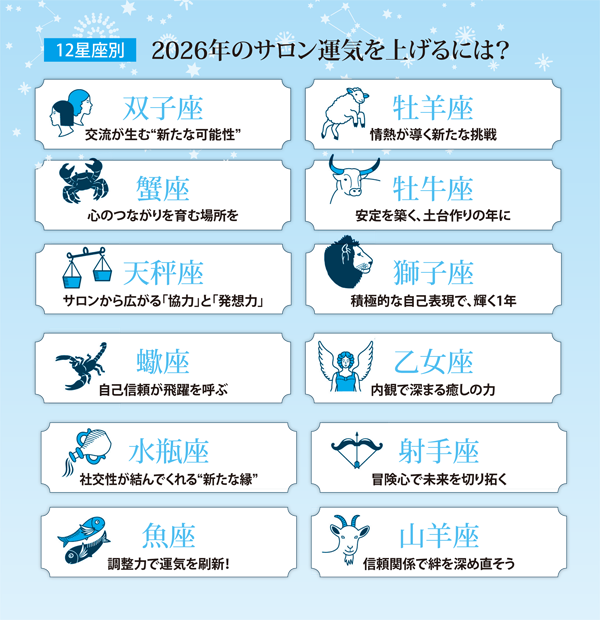 最後に、各星座ごとの“サロン運気を上げるキーワード”をお伝えしておきます!