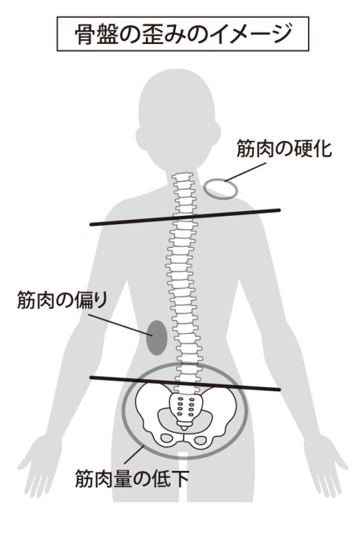 一般的にいわれる「骨盤の歪み」とは、骨が変形しているイメージをしてしまいますが、そうではありません。実際には骨盤を支える筋肉の衰えや、姿勢・生活習慣のクセによるバランスの乱れが原因なのです。