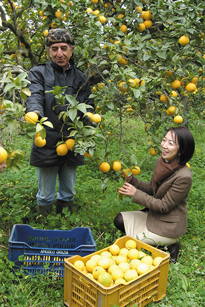写真は、イタリア半島の先端・レッジョ・カラブリアでベルガモットに触れる佐々木さん。元来「好きな香りではなかった」が、生のベルガモットの香りに触れて価値観が大きく変化したそうです。