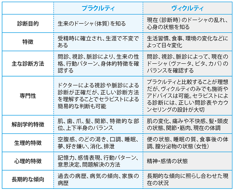 生まれ持った体質や気質の「プラクルティ」と、現在の心身の乱れを判断する「ヴィクルティ」。アーユルヴェーダでは、この2つを総合的に診断することで、その人に最適な食事、施術、生活習慣のアドバイスを提案しています。