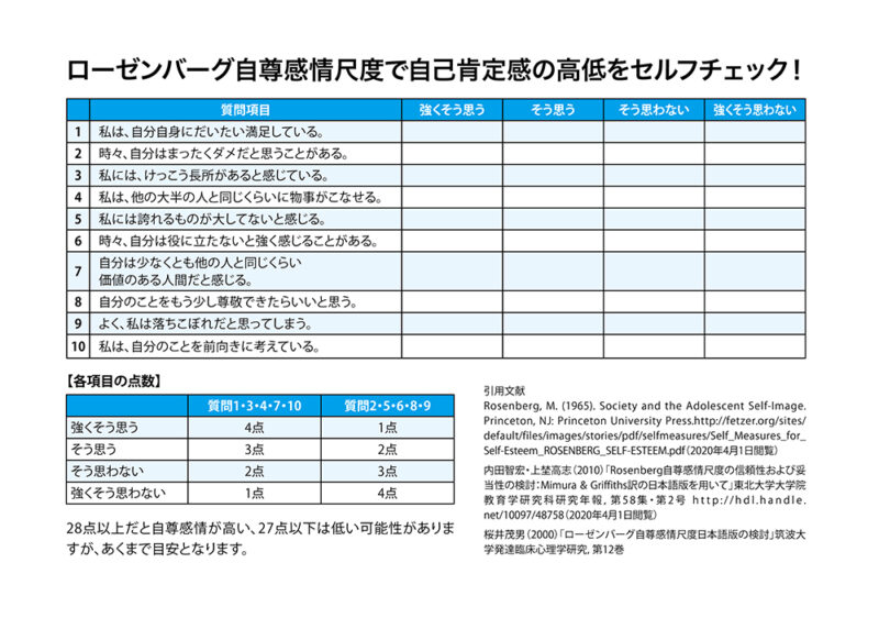 国内外で広く用いられている自己肯定感(自尊感情)の程度を測定する尺度で、以下10項目について、①強くそう思う ②そう思う ③そう思わない ④強くそう思わない、のいずれかを選び、合計点を算出します。