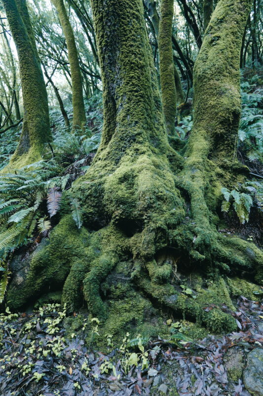 森に入るとしっとりとした空気が身を覆い、地面のあちらこちらからそっと顔を出すキノコや、岩肌や木の表面を覆う豊かな苔・地衣類に目を奪われます。草花は一度枯れ、甘い香りの月桂樹や神話に出てきそうなオークなどの常緑樹が静かにたたずんでいます。