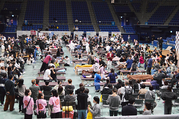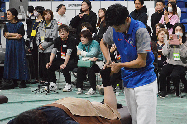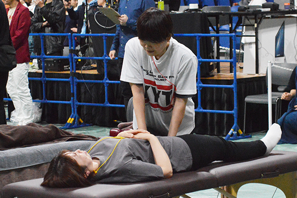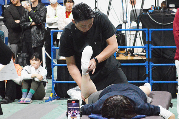 また、競技中はもちろん出展ブース内や、会場に設けられた「青空整体コーナー」(設置された施術ベッドを使い、誰でも無料で施術をしたり受けたりすることができるコーナー)、さらには客席でも整体やストレッチをしあう姿が見られた。