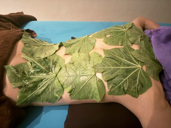 家族で一緒に施術中。葉っぱには以外とたっぷりのオイルが塗られているのが分かる