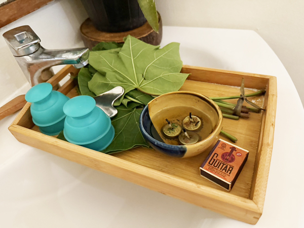 施術道具たち。ここでもキャンドルの直火を使う