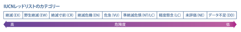 - ICUNレッドリストのカテゴリーは絶滅 (EX):野生絶滅 (EW):絶滅寸前 (CR):絶滅危機 (EN):危急(VU):準絶滅危惧 (LC/NT):軽度懸念 (LC):未評価 (NE):データ不足 (DD)に分けられている